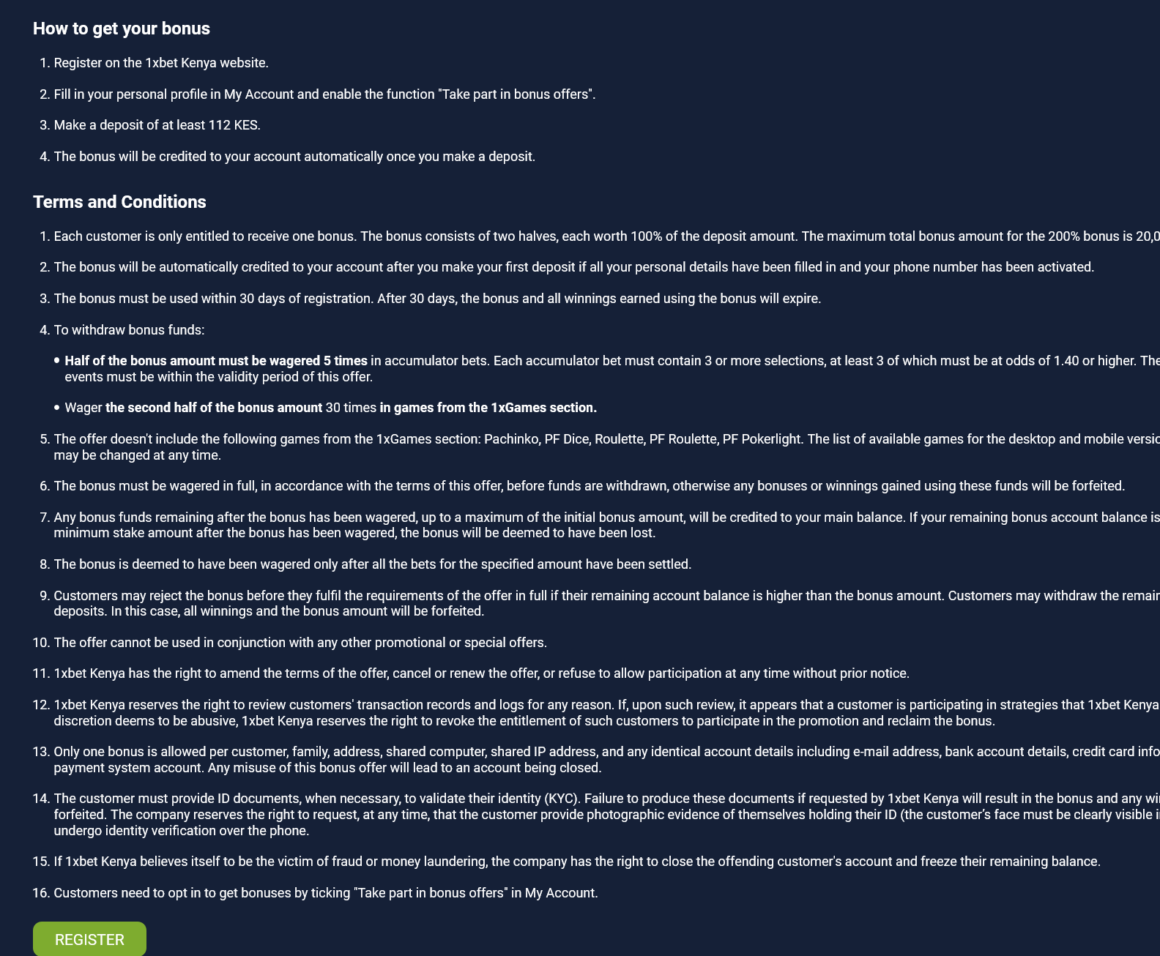 1XBET Kenya offers a welcome bonus of up to 200% of the first deposit. To get the bonus, first register here,click here to register